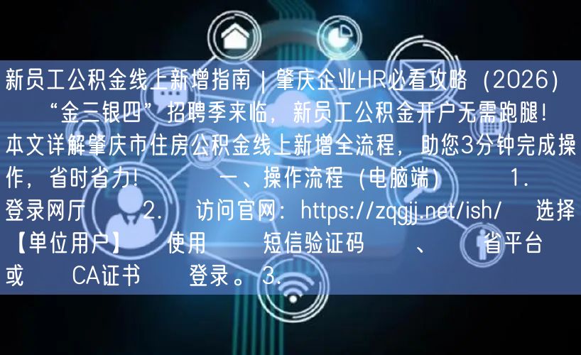 新员工公积金线上新增指南|肇庆企业HR必看攻略(2026)“金三银四”招聘季来临,新员工公积金开户无需跑腿!本文详解肇庆市住房公积金线上新增全流程,助您3分钟完成操作,省时省力!